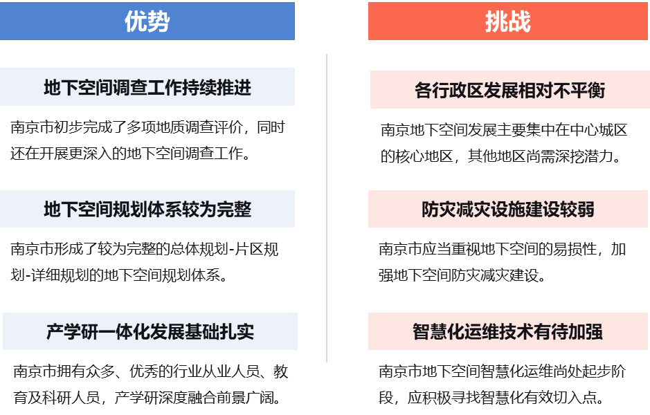 总体来看,南京市地下空间的发展正由“量的积累”转向“质的规范”,综合管理体系不断优化,地下空间规划编制持续完善,地下空间信息普查基本完成,各项地下空间开发建设有序推进,形成了地下空间发展的六大特色,在未来发展中具有巨大的发展潜力,也面临发展的挑战。