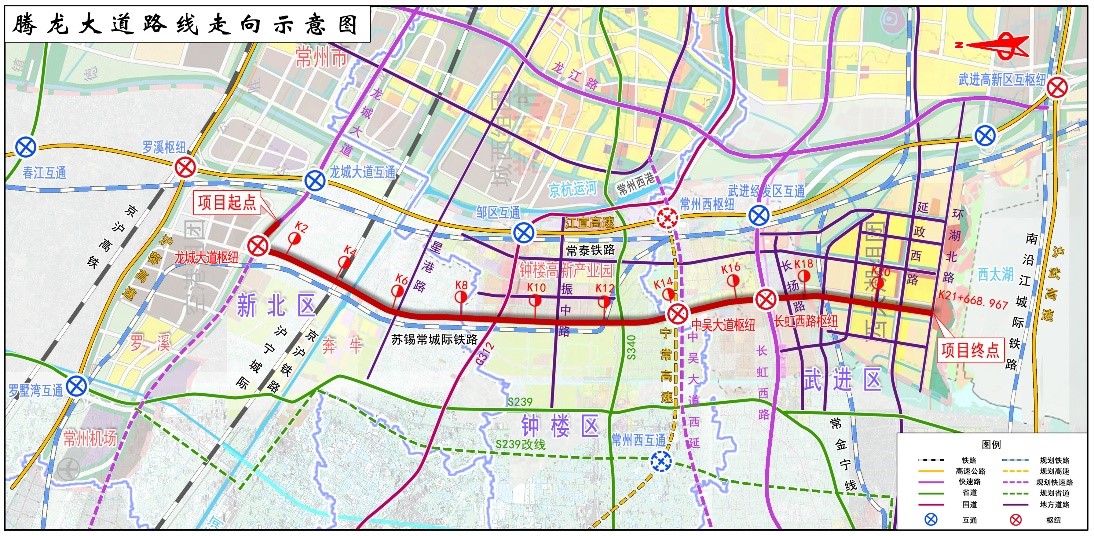 腾龙大道工程起于“两湖”创新区核心区环湖北路,向北止于黄河西路,全长约23.5km,工程建安费约113.7亿元。其中,环湖北路至长虹西路4.9km采用城市主干道标准,长虹西路以北18.6km采用主六辅六高架式快速路标准。全线设置枢纽式互通2座,高架出入口13对。