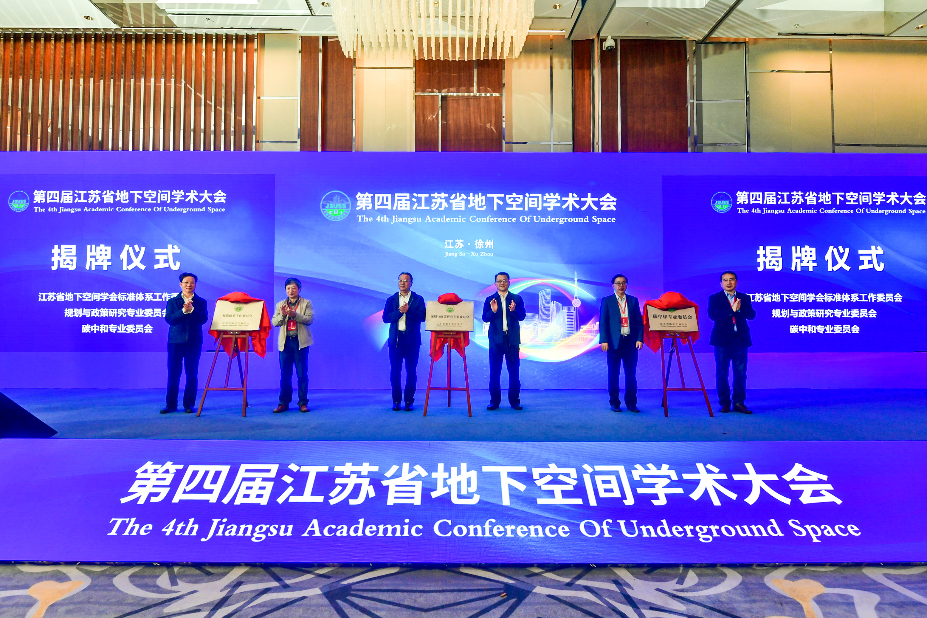 江苏省住建厅副处长张海达,江苏省地下空间学会理事长黄富民为标准体系工作委员会揭牌;徐州地铁集团董事长朱明勇,徐州市自然资源和规划局党组副书记、副局长周宣东为规划与政策研究专委会揭牌;江苏省科协党组成员、副主席冯少东,中国矿业大学深部岩土力学与地下工程国家重点实验室主任李晓昭为碳中和专委会揭牌。