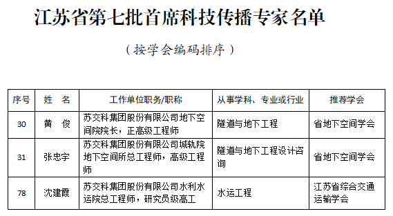 近日,江苏省科协公布了《关于公布江苏省第七批科技传播专家服务团、首席科技传播专家和省科普演讲专家的通知》。其中,经各省级学会推荐、专家评审(审核)、公示并研究决定,聘任集团首席工程师(地下空间)黄俊、水利水运勘测设计研究院总工程师沈建霞、城轨院隧道与地下空间所总工程师张忠宇为“江苏省第七批首席科技传播专家”,聘期3年。
