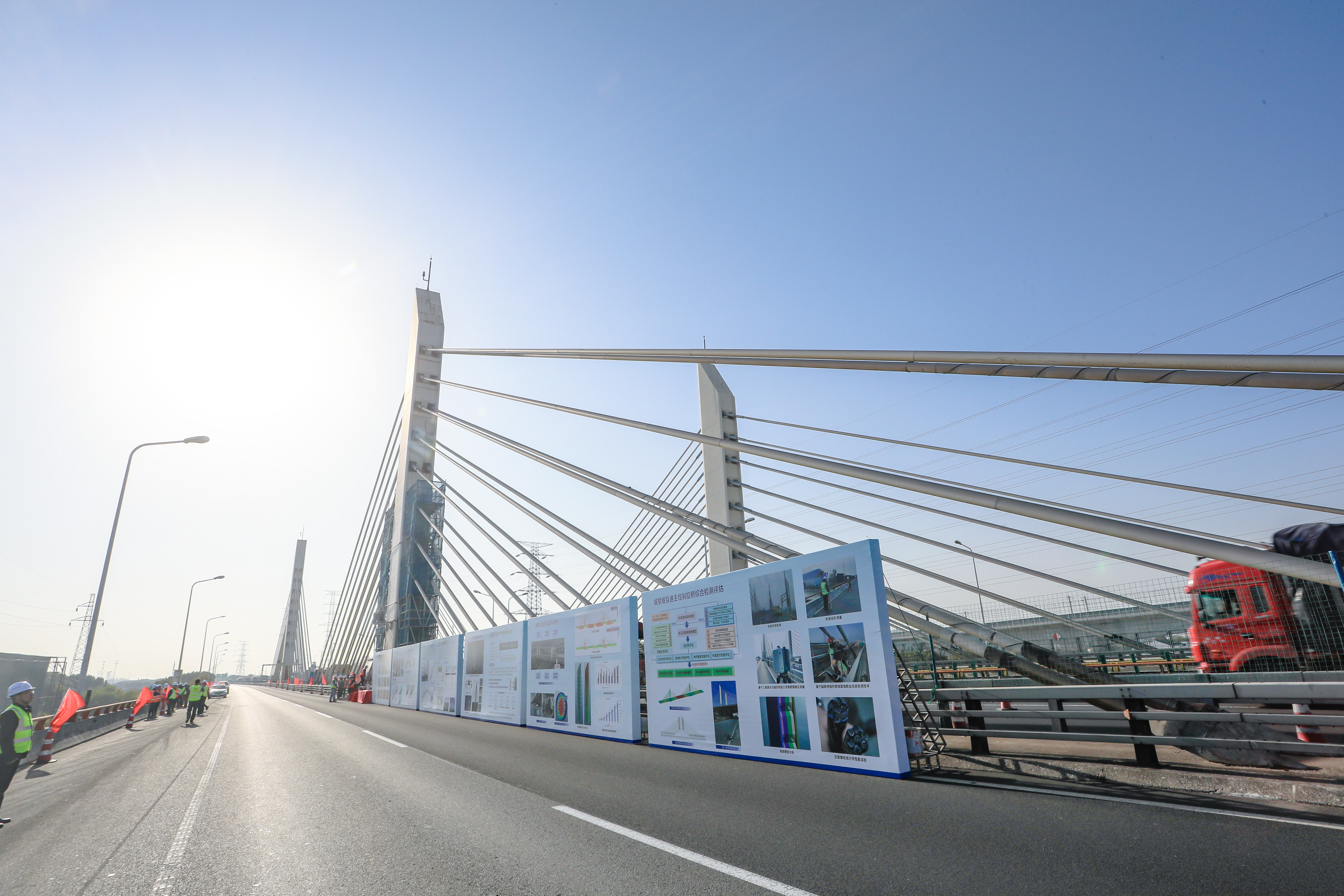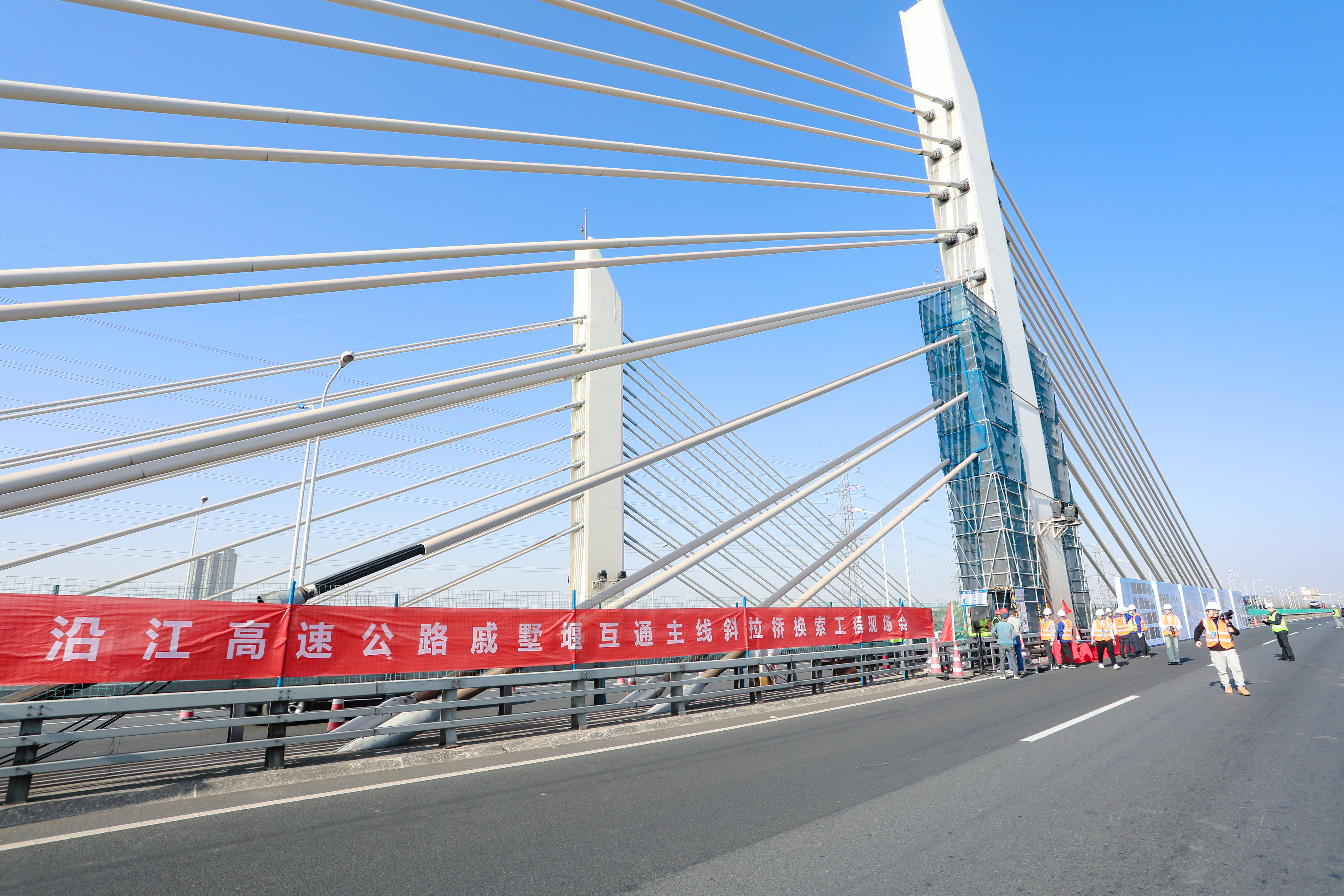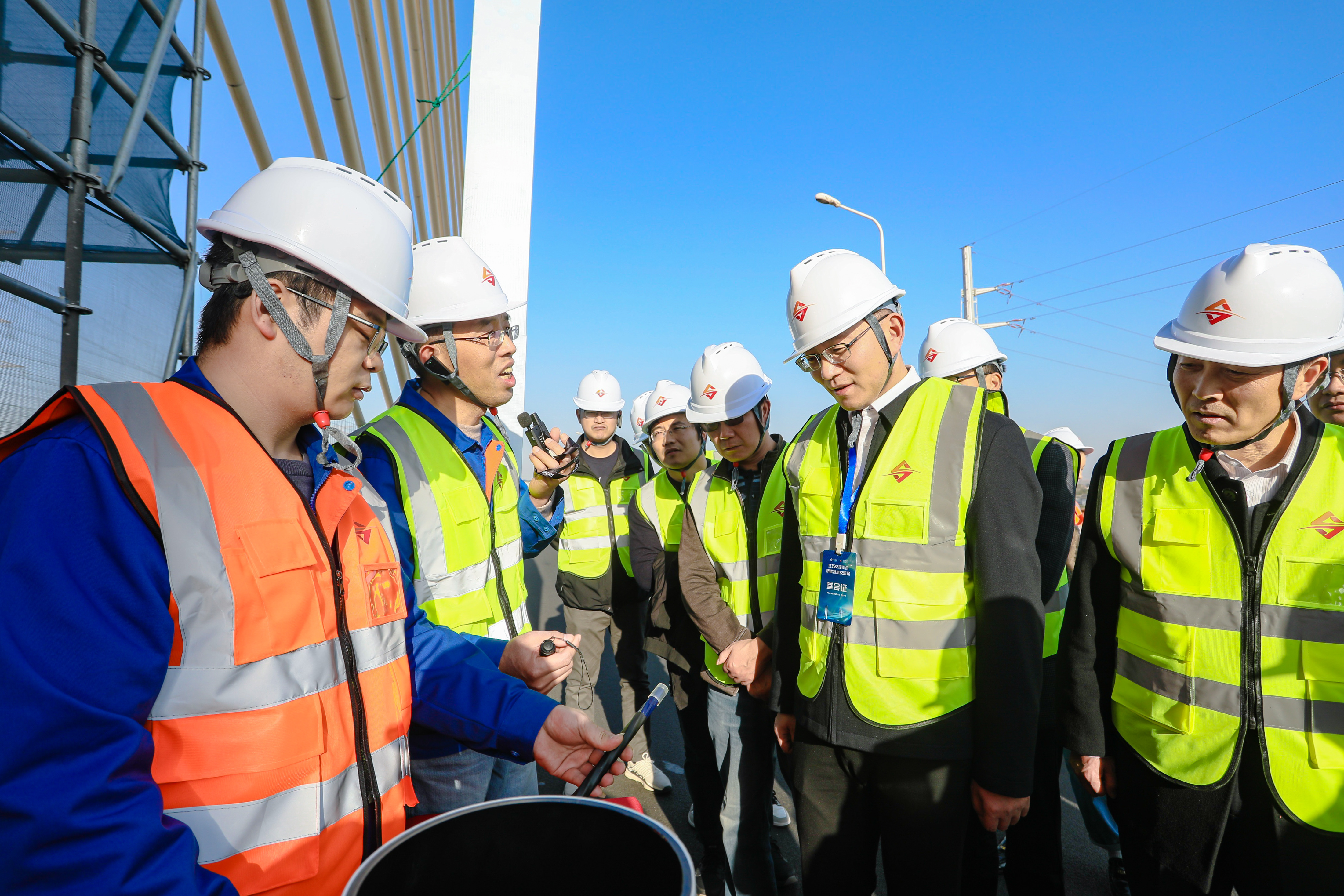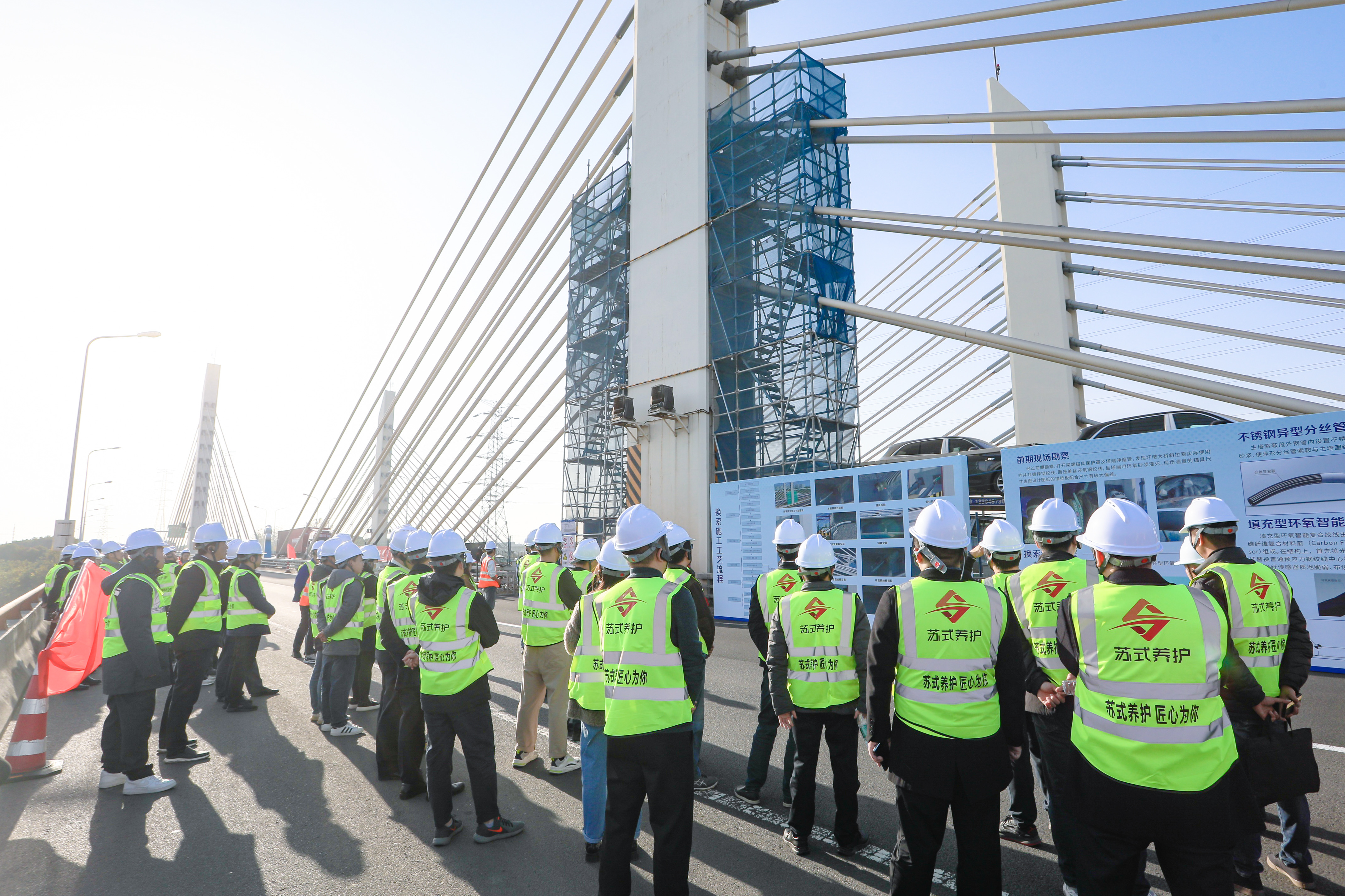会后,与会代表参观了戚墅堰互通主线斜拉桥换索施工现场,观摩了钢绞线退张过程、异型分丝管索鞍结构和智能复合绞线实样,听取了换索工程安全监测与评估技术、换索施工工艺流程和无人机智能桥梁检测系统等相关介绍。