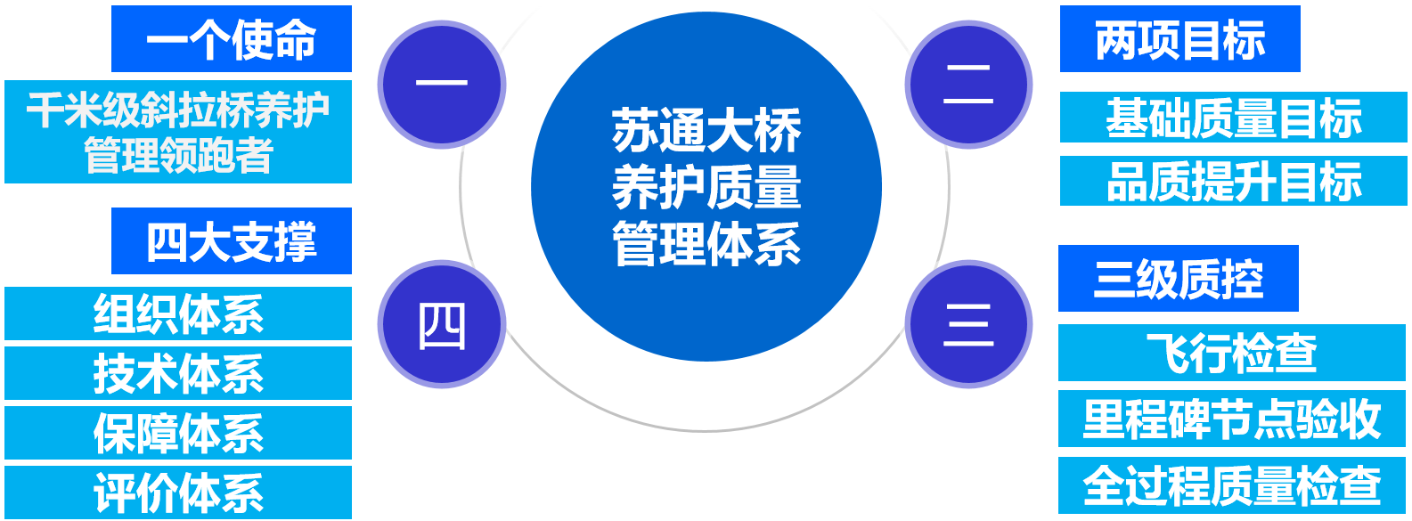 作为集团首次承担的长大桥养护质量管理提升类项目,项目组依托苏通长江大桥,针对运营环境差、交通流量大、技术难点多、社会关注度高的特点,面向长大桥作业规范不完善、全过程质量监督制度不健全、全要素质量保证体系不完备等需求,以“苏式养护”品牌为指引,攻坚克难、积极探索,构建了“1个使命、2项目标、4大支撑、3级管控”的养护质量管理体系,提出了以项目为载体的组织管理模式,制定了养护全过程的质量管控方法。