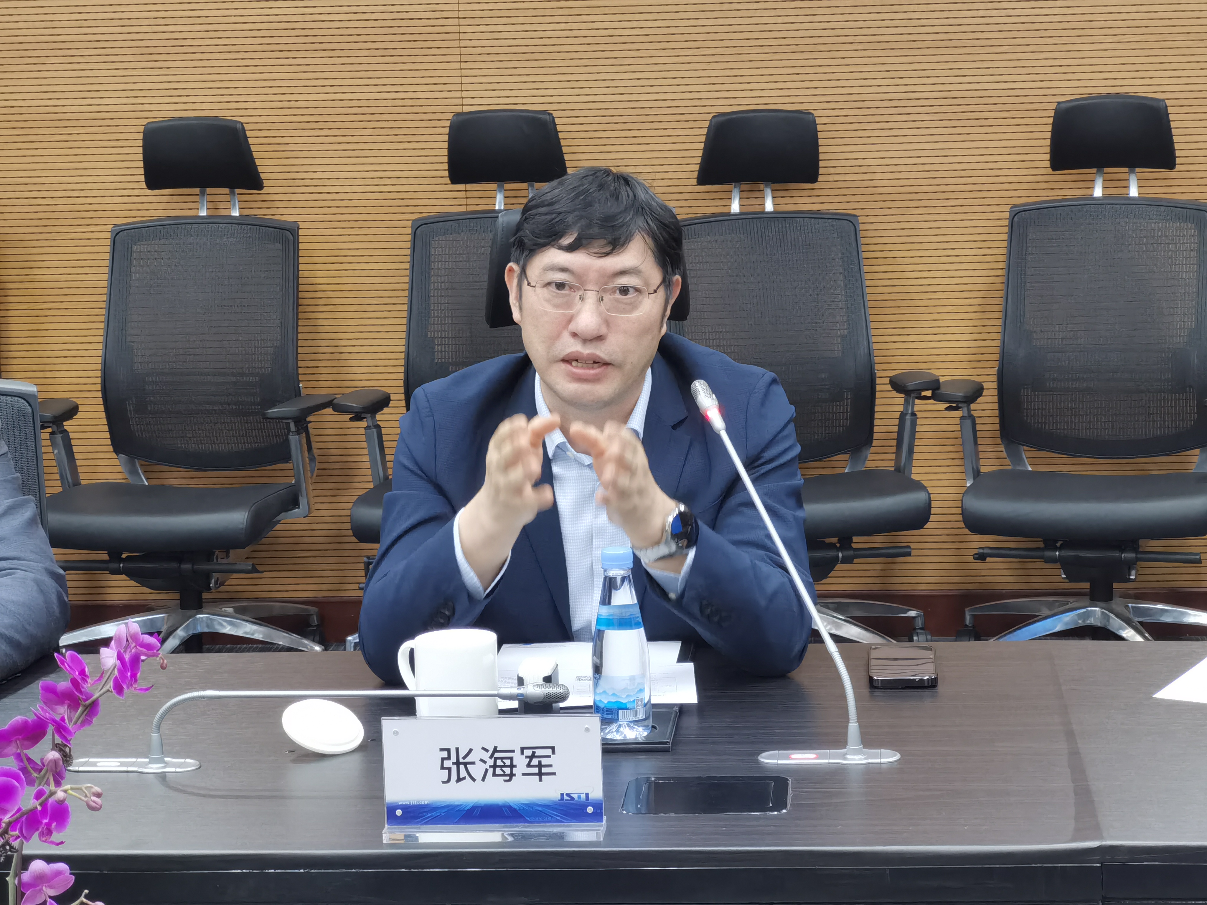 张海军副总裁对程飞副总经理一行来访表示热烈欢迎,并详细介绍了集团科技创新管理、国家重点实验室建设和运营管理经验、“悟空云” 助力交通基础设施数字化转型方案等方面的工作。他表示,希望未来能与铁路集团广泛形成协同合作,携手探索铁路科技创新高质量发展,全力支持“江苏省智能与绿色铁路工程研究中心”(以下简称研究中心)建设。