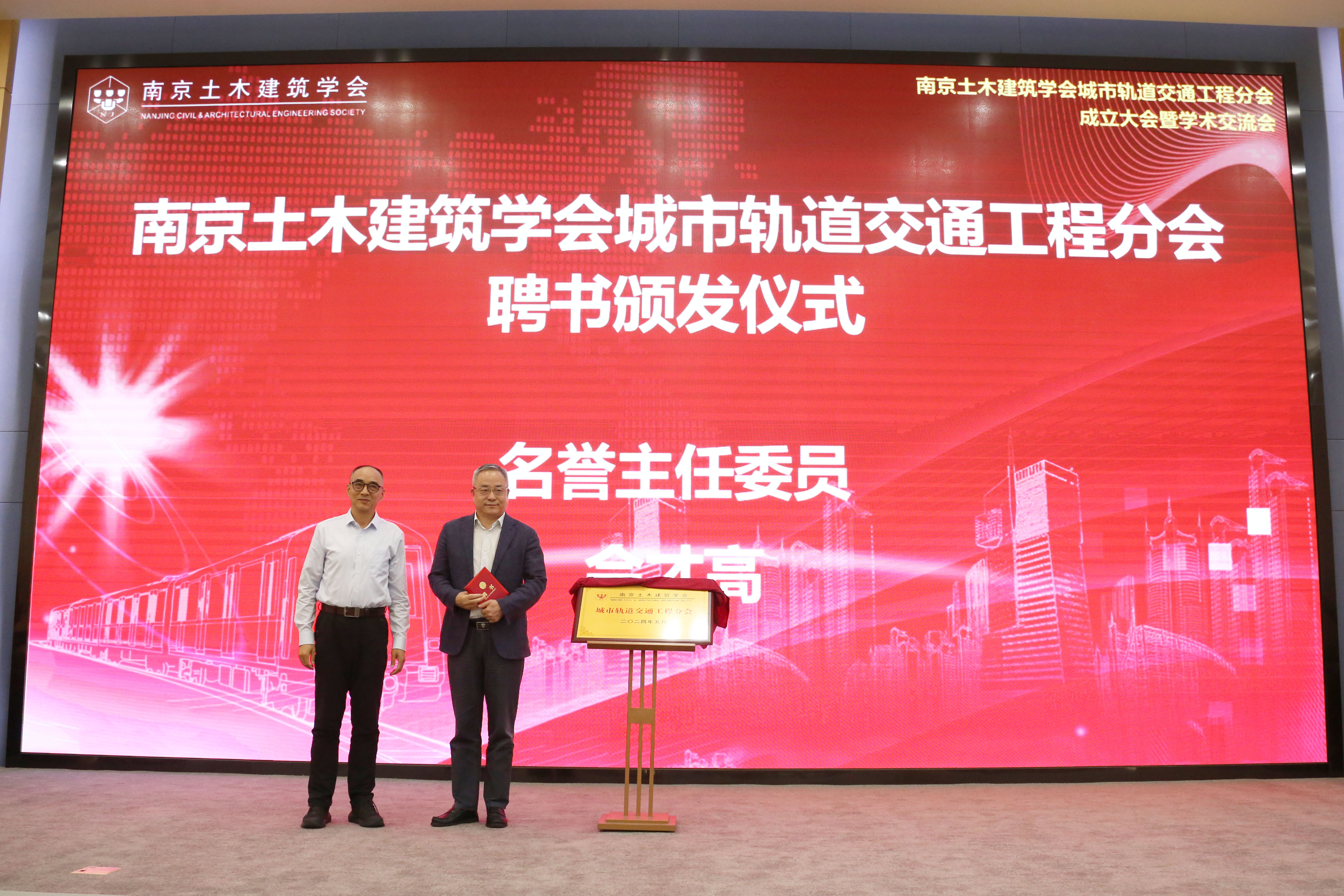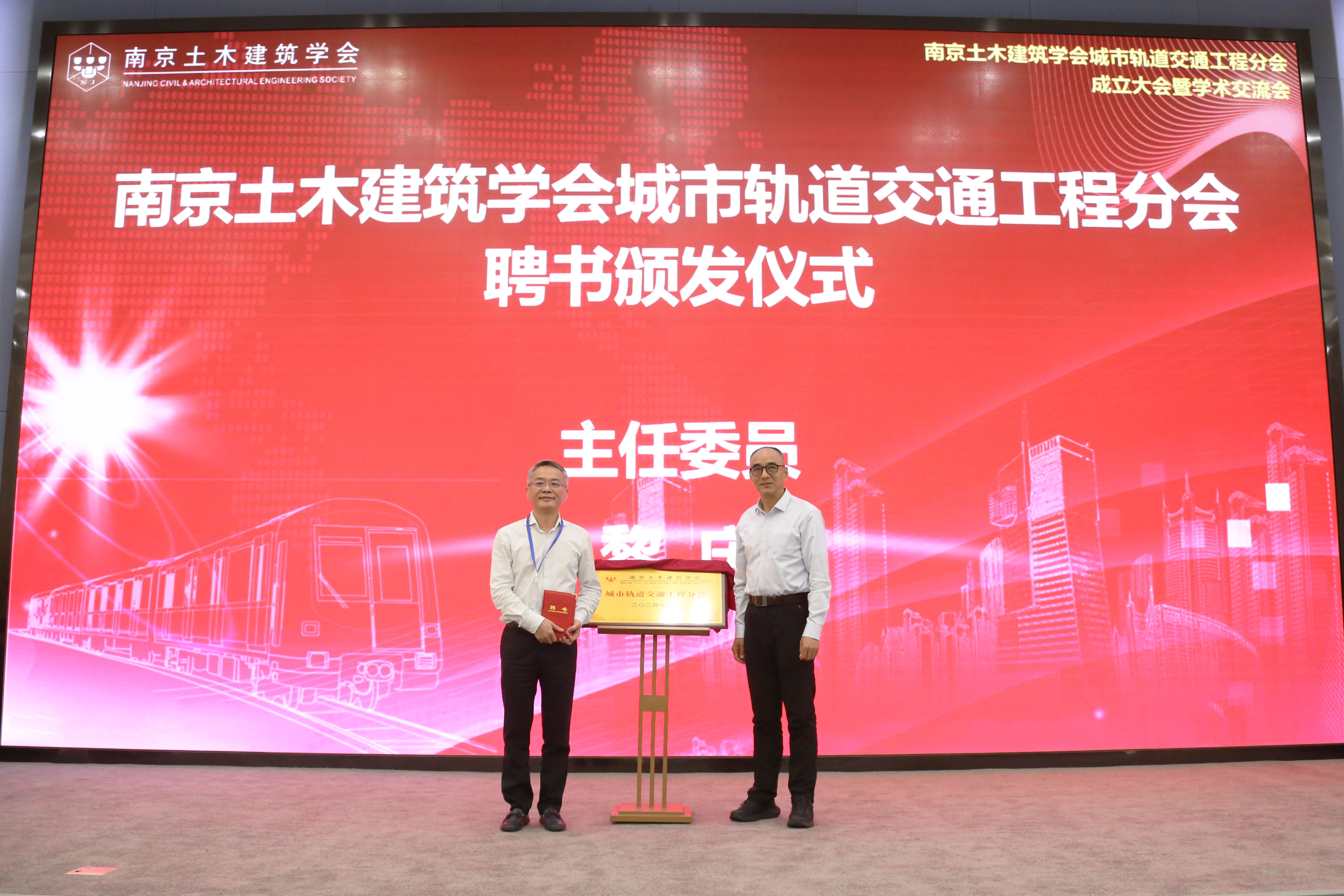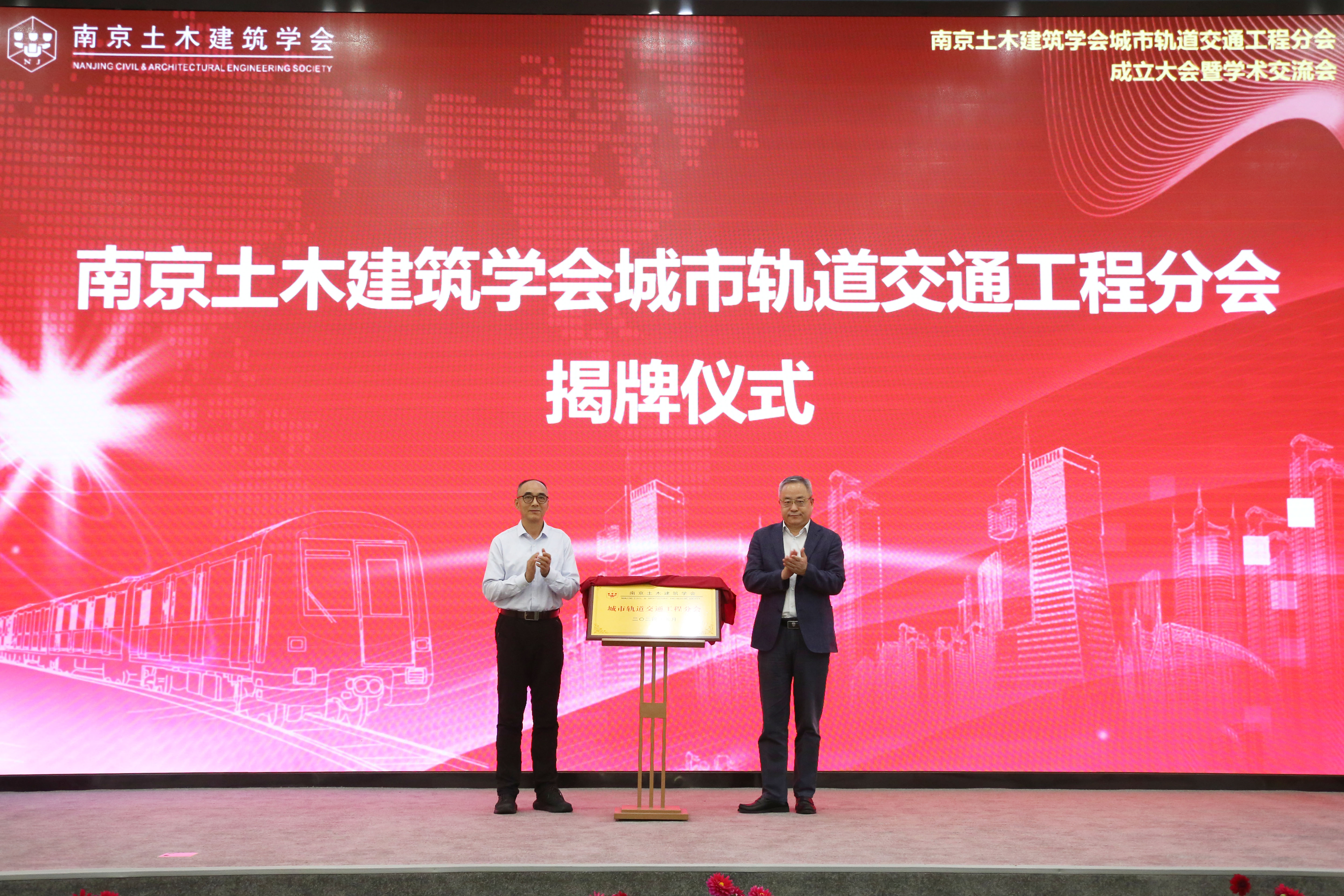 南京土木建筑学会理事长郭宏定、南京地铁集团有限公司董事长佘才高,共同为城轨交通分会揭牌。