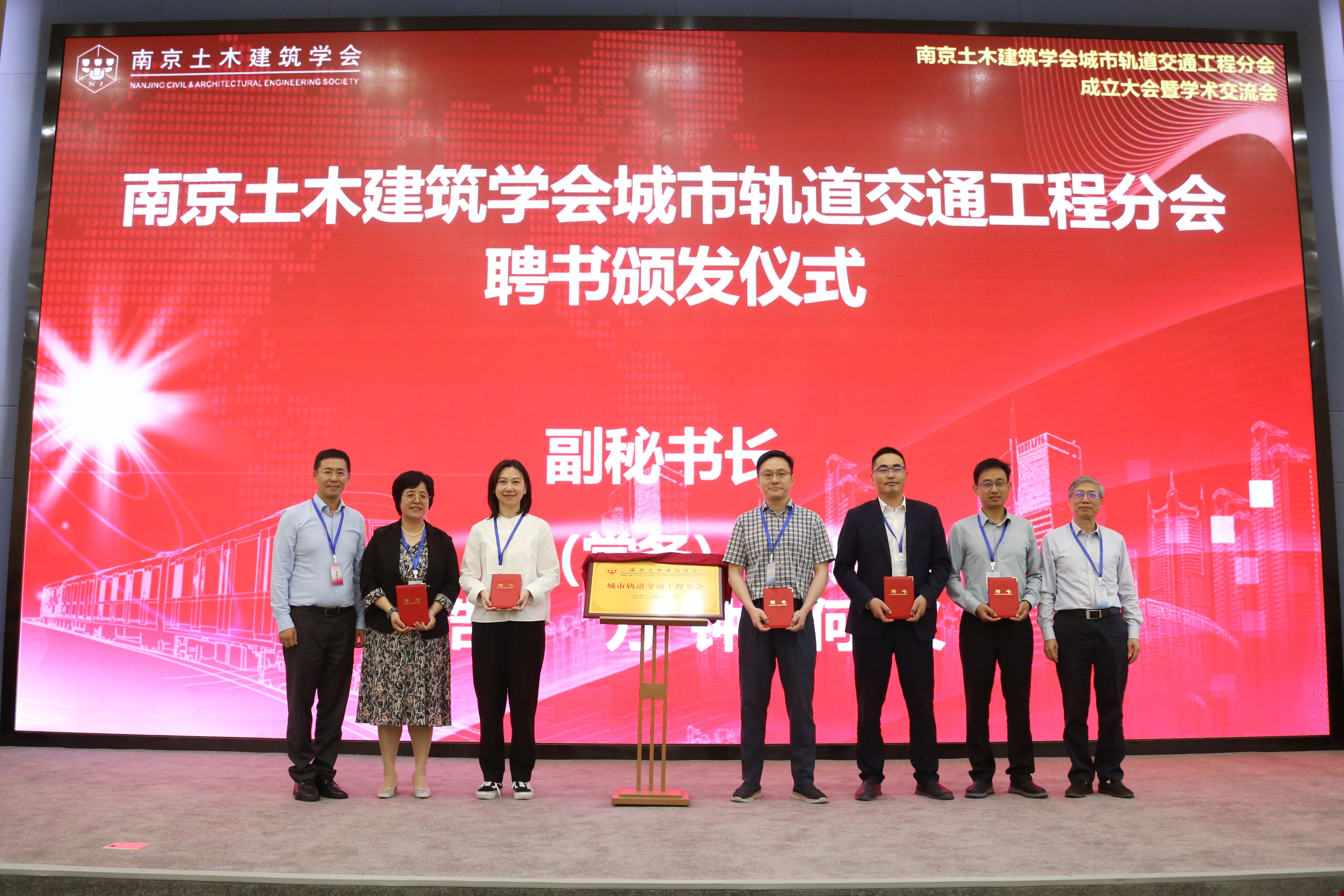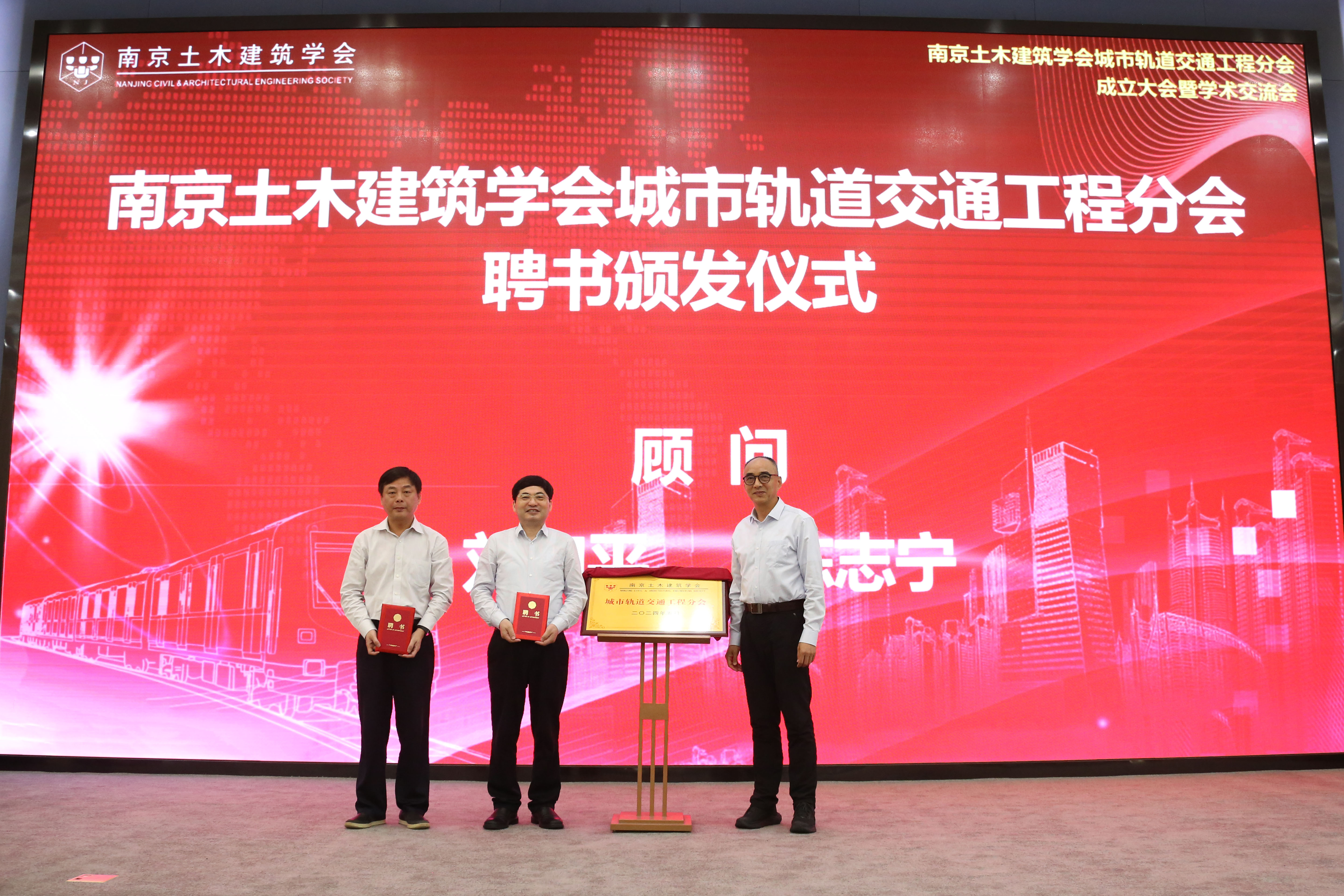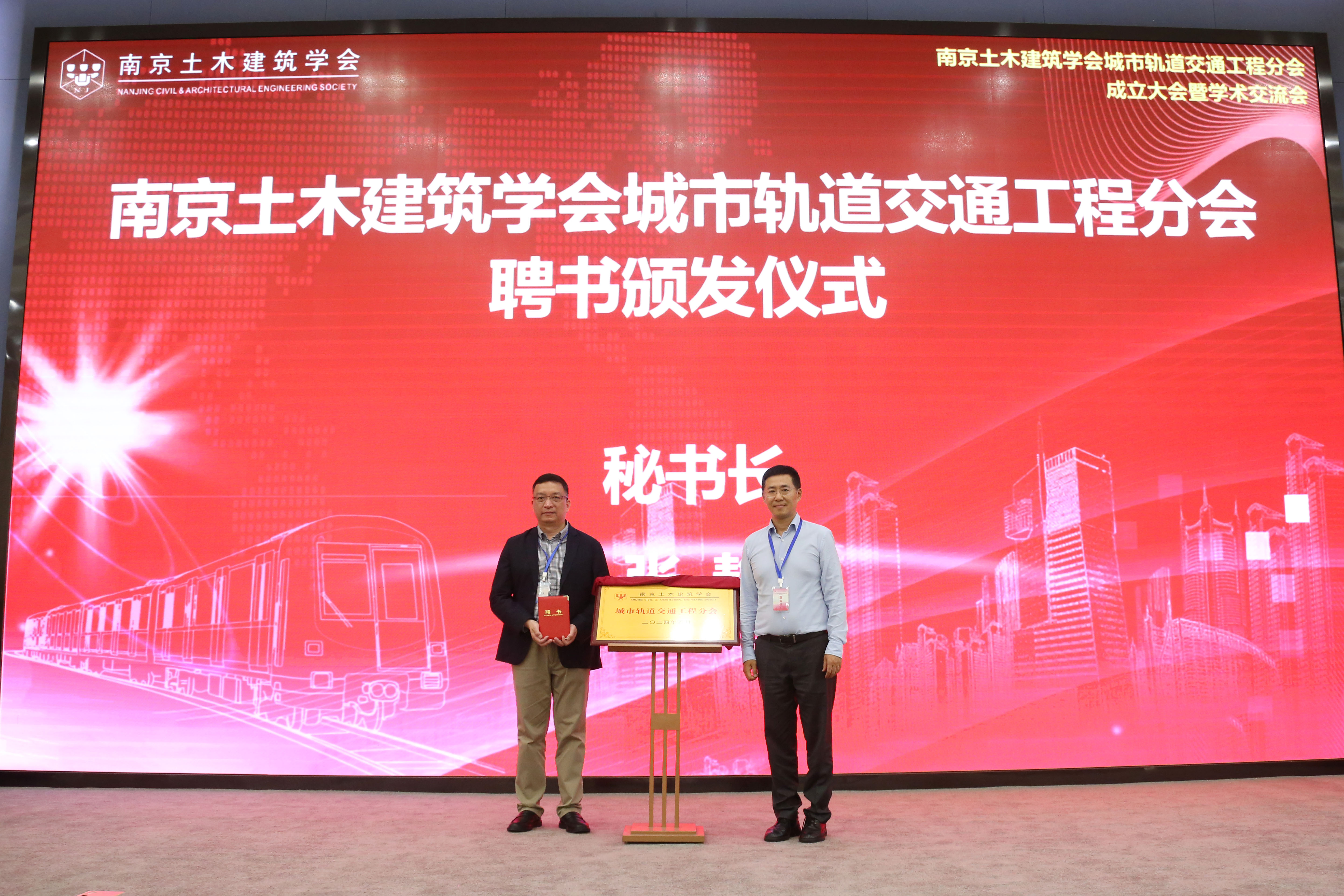 南京土木建筑学会理事长郭宏定、南京地铁集团有限公司董事长佘才高,共同为城轨交通分会揭牌。
