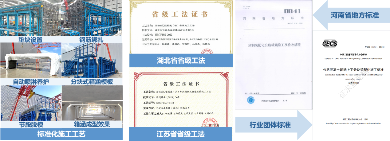 为推动预制箱涵低碳快速建造,保障预制箱涵施工质量,首次建立了预制箱涵标准化施工工艺及成套质量控制标准体系,研发了系列预制箱涵高效吊装装备及质量管控方法,提升了预制箱涵低碳高效建造水平。
