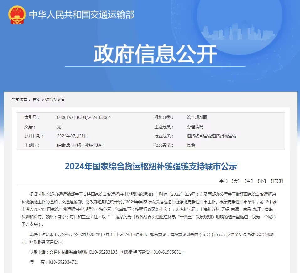 近日,交通运输部、财政部组织开展了2024年国家综合货运枢纽补链强链城市竞争性评审工作。最终经过激烈角逐,