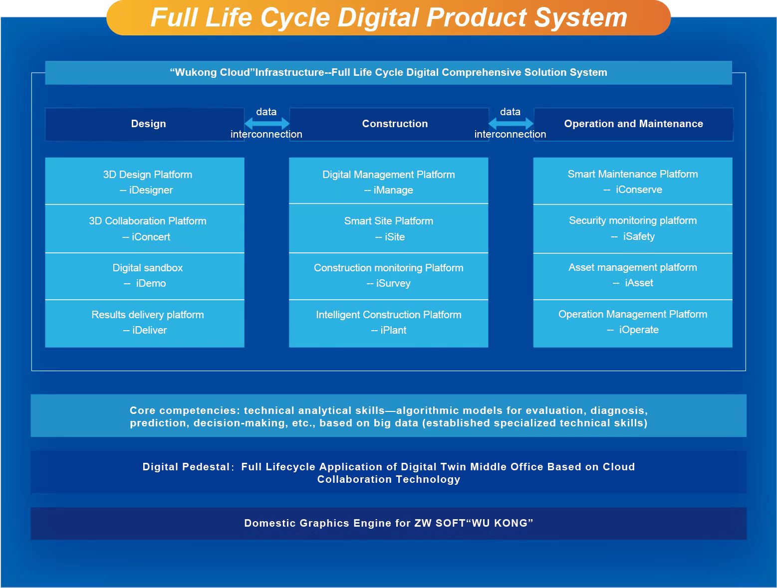 集团自主研发“悟空云”底层引擎,解决工业软件“卡脖子”问题,涵盖工程建设“建管养运服”全过程,以“悟空”国产图形底层为核心,同一云端数据底座为底层,通过与大数据分析、人工智能及各类专业分析引擎的深度融合,逐步形成了服务于基础设施的独特的核心算法能力。按照设计、施工、运维不同阶段和各类应用需求分阶段、分场景建立相应的“悟空云”基建全生命周期的应用体系,实现基础设施感知监测、评估诊断、预警预测等决策支持功能。
