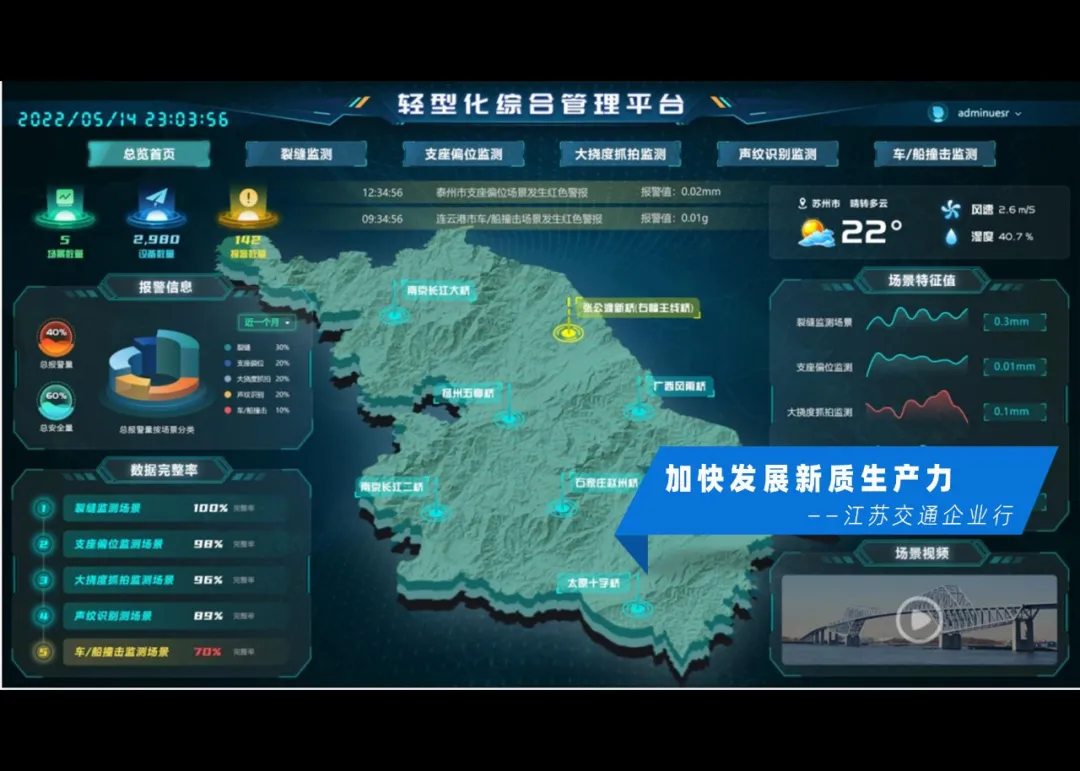 2022年,在省交通运输厅的组织下,厅公路事业发展中心和英国上市公司365联合开展江苏省干线公路重点桥梁轻量化监测技术研究,并于同年9月印发《江苏省普通国省道桥梁轻量化监测系统建设指南》,建立全国首个桥梁轻量化监测标准体系,为行业发展贡献智慧。